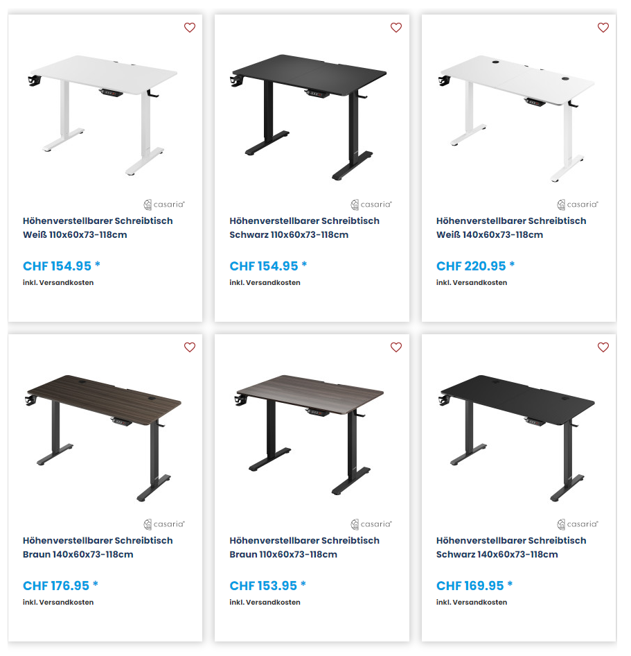 Bei DeubaXXL gibt’s ein weiteres hammermässiges Angebot. Ihr könnt euch nämlich elektrisch höhenverstellbare Schreibtische zum tiefen Preis ab nur 139 Franken sichern. Dabei stehen euch die beiden Grössen 110cm x 60cm und 140cm x 60cm zur Auswahl. Je nach dem welche Farbe ihr auswählt, kann der Preis etwas höher ausfallen. Und auch wenn es nicht die qualitativ besten Schreibtische sein dürften, gibt’s für diesen Preis absolut nichts zu meckern. Schliesslich fällt sogar die Lieferung gratis aus!