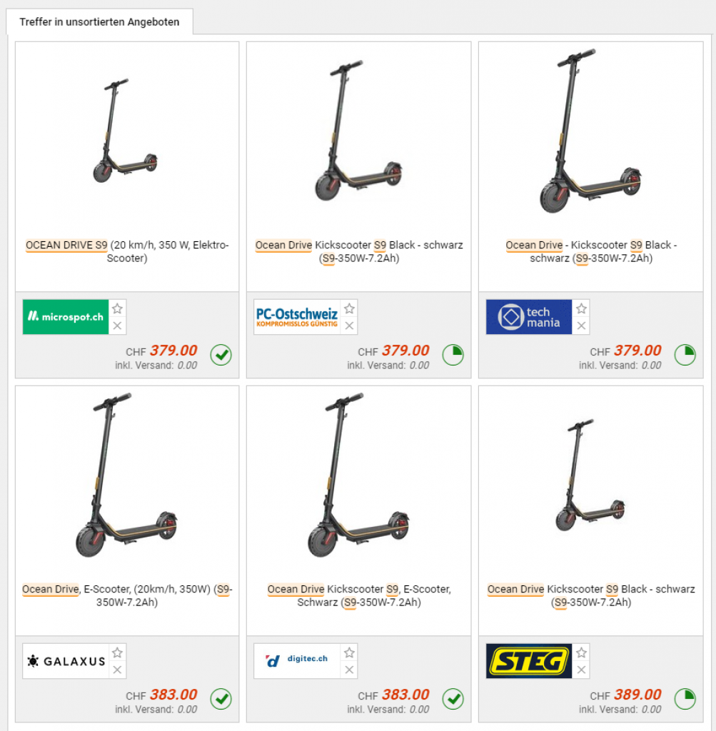 Bei Interdiscount gibts derzeit den eScooter Ocean Drive zum Aktionspreis von knapp 359 Franken. Mit dem bekannten 15 Franken Bon spart ihr ein Stück weiter und drückt den Preis auf CHF 344.10. Laut toppreise starten die Preise sonst bei 379 Franken.
