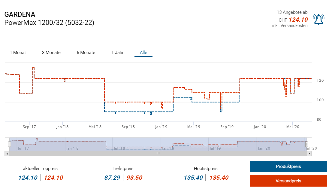 Bei Amazon gibts derzeit den Elektrorasenmäher PowerMax 1200/32 von Gardena zum neeun Bestpreis von knapp 72 Franken. Laut toppreise lag der bisherige Bestpreis bei CHF 93.50 inkl. Lieferung, das zweitgünstigste Angebot gibts derzeit ab 119 Franken bei Nettoshop. Beachtet einfach, dass die Gerätschaft derzeit nicht an Lager ist und ihr mit einer längeren Lieferfrist (mind. 2 Wochen) rechnen solltet.