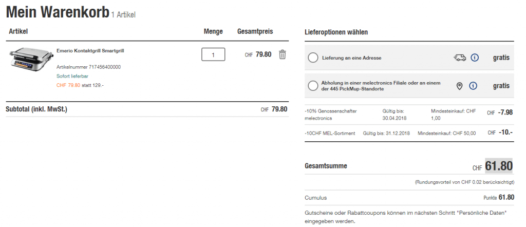 Melectronics bietet aktuell den Emerio Kontaktgrill zum Best Price von 79.80 an. Ansonsten findet man den Grill bei ungefähr 100 CHF.