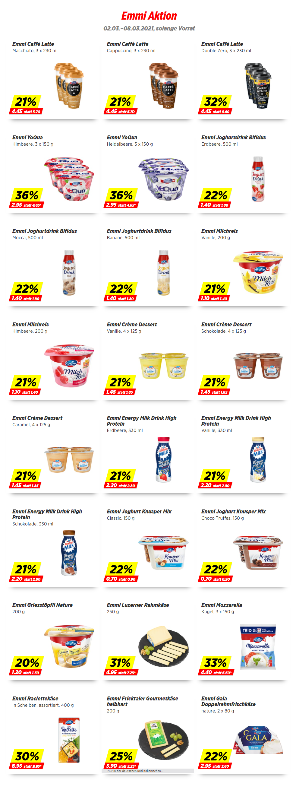 Bei Denner gibt es auf eine vielzahl an Emmi Produkten gerade Rabatt - die beliebten Caffè Latte, Joghurts, Milchdrinks bis hin zu Proteindrinks und Käse ist alles dabei. Die Aktion läuft nur noch bis und mit Montag 08.03.