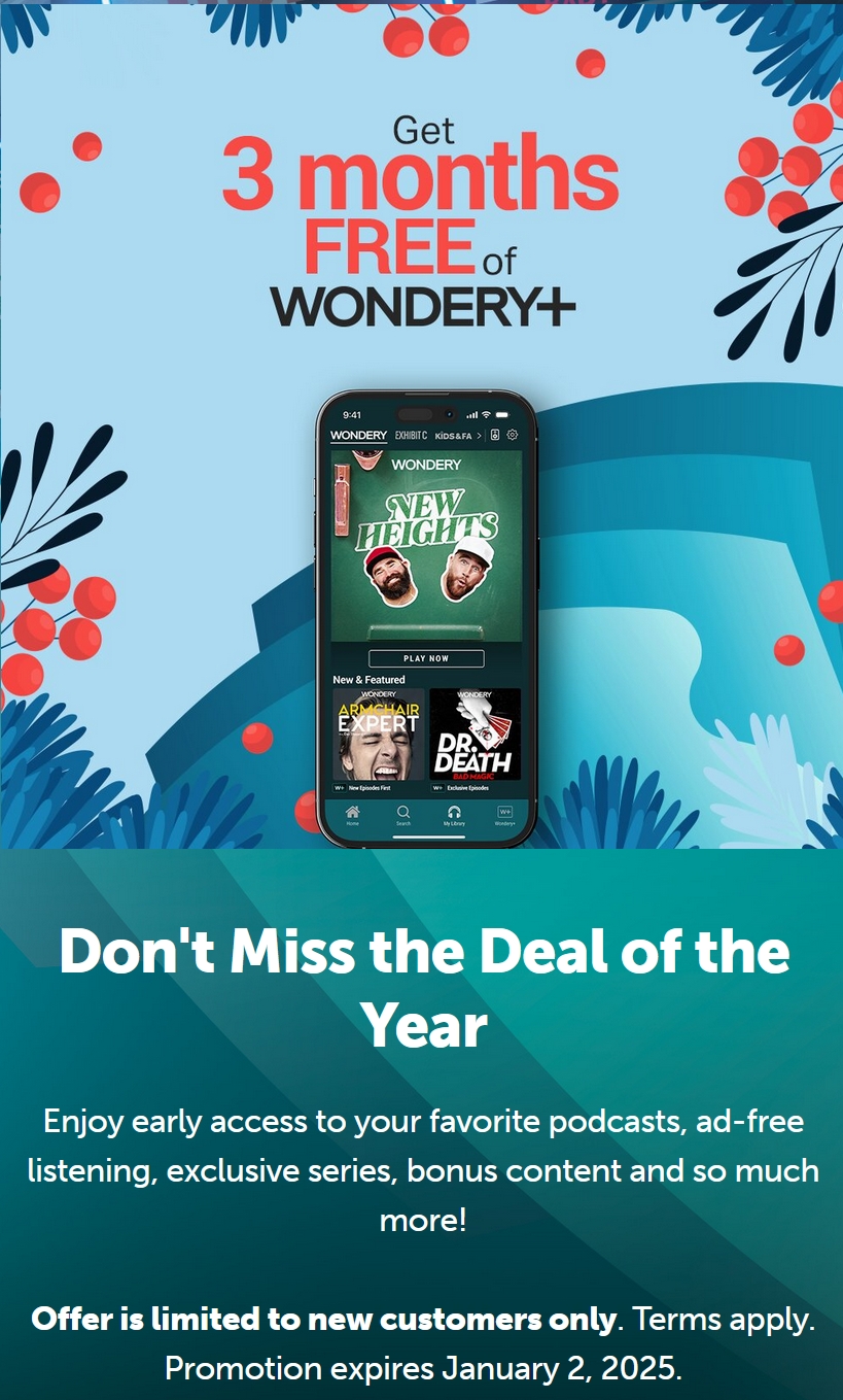 Etwas zum Hören für die Weihnachtsferien gefällig? Der US-amerikanische Podcastanbieter Wondery hat gerade eine verlängerte gratis Testphase von 3 Monaten. Im Angebot sind ausschliesslich Englischsprachige Podcasts mit Schwerpunkt True Crime und Investigativjournalismus. Die Kreditkarte muss angegeben werden (Revolut hat bei mir funktioniert) und das Abo muss vor Ablauf der 3 Monate gekündigt werden. Das Abo kann direkt gekündigt werden, der Testzeitraum bleibt erhalten. Empfehlenswert finde ich u.a. die Podcasts Dr. Death, One Click, The Shrink Next Door und Whakaari. Das Angebot ist gültig bis am 2. Januar 2025.