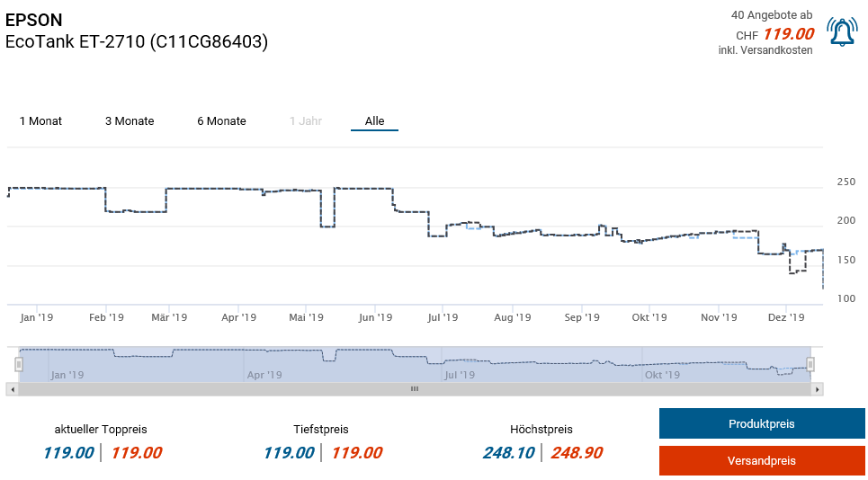 Bei digitec gibt es aktuell den EPSON EcoTank ET-2710 für 119. CHF. Zusätzlich gibt es über Epson noch 40.- CHF Cashback.