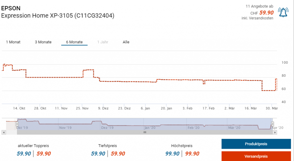 Bei Fust gibt es den EPSON Expression Home XP-3105 Drucker schon seit 3 Wochen zum neuen Bestpreis von CHF 59.90. Der vorherige Bestpreis war CHF 69.95. Der zweitbeste Preis beträgt CHF 77.60.