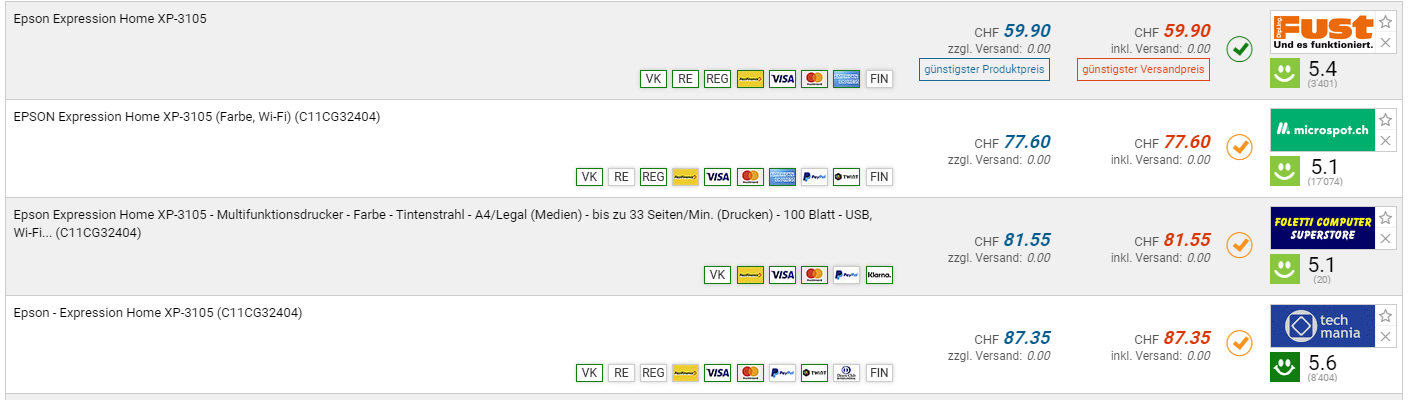 Bei Fust gibt es den EPSON Expression Home XP-3105 Drucker schon seit 3 Wochen zum neuen Bestpreis von CHF 59.90. Der vorherige Bestpreis war CHF 69.95. Der zweitbeste Preis beträgt CHF 77.60.