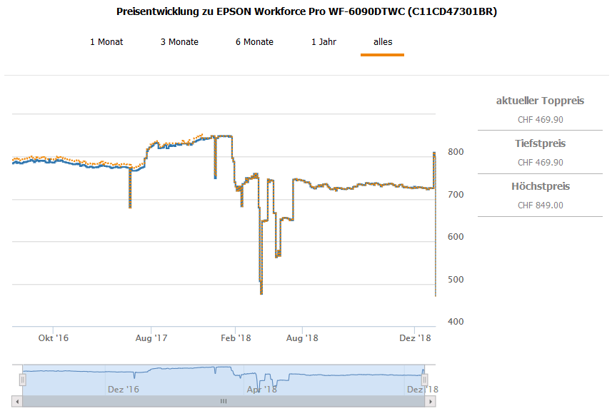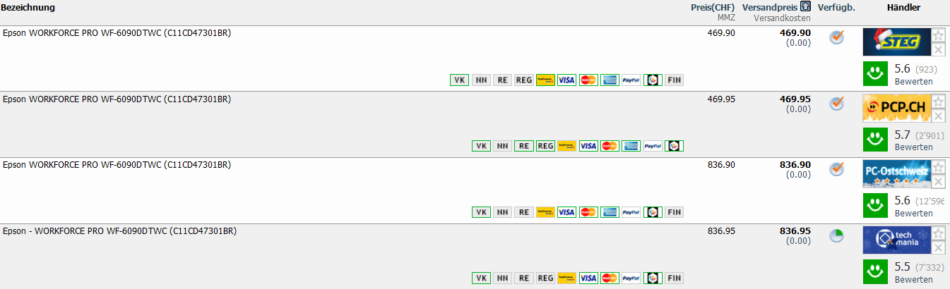 Bei STEG / PCP gibt es gerade den EPSON Workforce Pro WF-6090DTWC für 469.90 CHF. Gemäss toppreise war der bestprice bislang bei 476.- CHF, der zweitbeste Preis aktuell liegt bei 836.90 CHF.