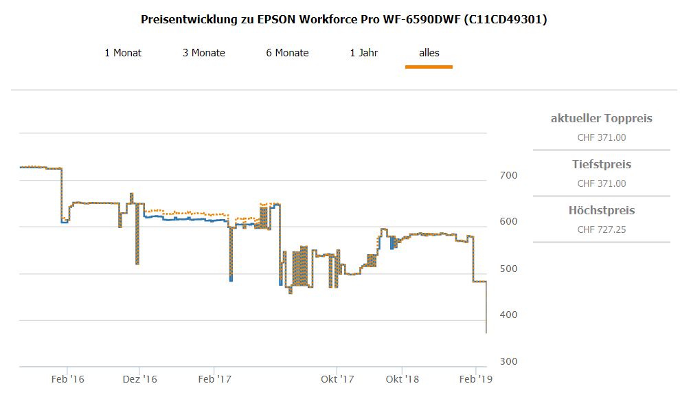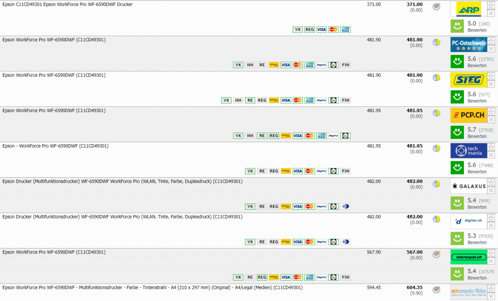 Bei ARP gibt’s den Epson WorkForce Pro WF-6590DWF Drucker zum neuen Bestpreis von CHF 371.- Zweitbester Preis in der Schweiz liegt bei CHF 481.90 wobei beispielsweise brack für den gleichen Drucker sogar CHF 609.- verlangt. Bestpreis laut toppreise lag bisher bei CHF 457.-