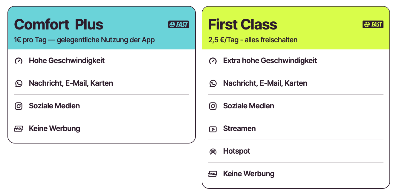 2. Fast (Comfort Plus, First Class) – Eine Premium-Option, die ab 1 € pro Tag beginnt und schnelles Internet für Streaming, Videoanrufe und soziale Medien bietet. Dieser Tarif ermöglicht es, die Datennutzung flexibel zu pausieren und wieder aufzunehmen, was für häufige Reisende kosteneffektiv sein kann
