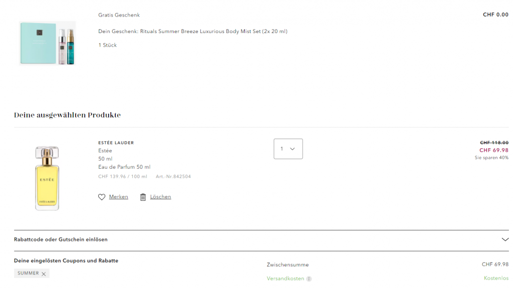 Bei Douglas gibt es aktuell das Estée Lauder “Estée” Eau de Parfum 50ml zum Aktionspreis von CHF 69.98.- zu ergattern. Im Warenkorb könnt ihr noch den Gutschein “SUMMER” eingeben und erhaltet noch zusätzlich ein gratis Rituals Summer Breeze Luxurious Body Mist Set (2x 20 ml) dazu. Das Angebot für das gratis Rituals Set gilt nur noch heute!!