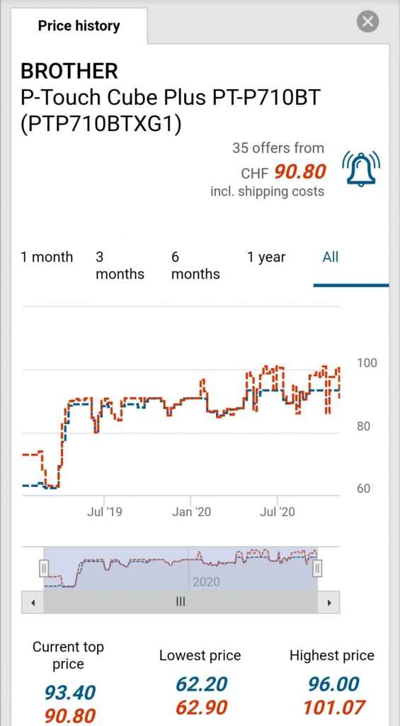 Bei digitec gibts derzeit den portablen Etikettendrucker Brother P-Touch Cube Plus zu Aktionspreis von 79 Franken. Laut toppreise liegt der zweitgünstigste Preis bei CHF 90.80