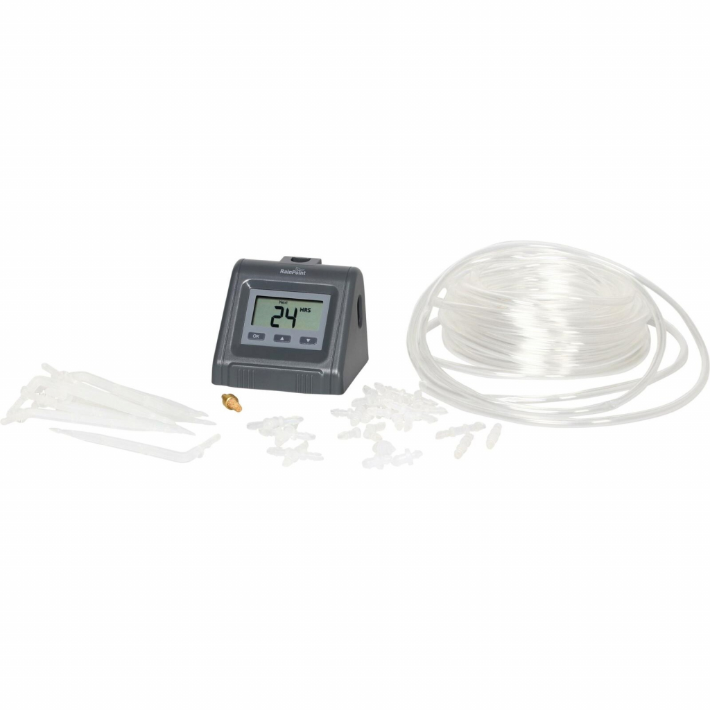 Im Set drin: 10m Saugschlauch, 1 x Saugventil mit Vorfilter, 10 x T-Rohrverbinder, 3 x Rohrverbinder, 3 x X-Rohrverbinder, 3 x Rohrendkappen, 10 x Mikro-Tropfenstrahler, 1 x Pumpe (programmierbar über Display)