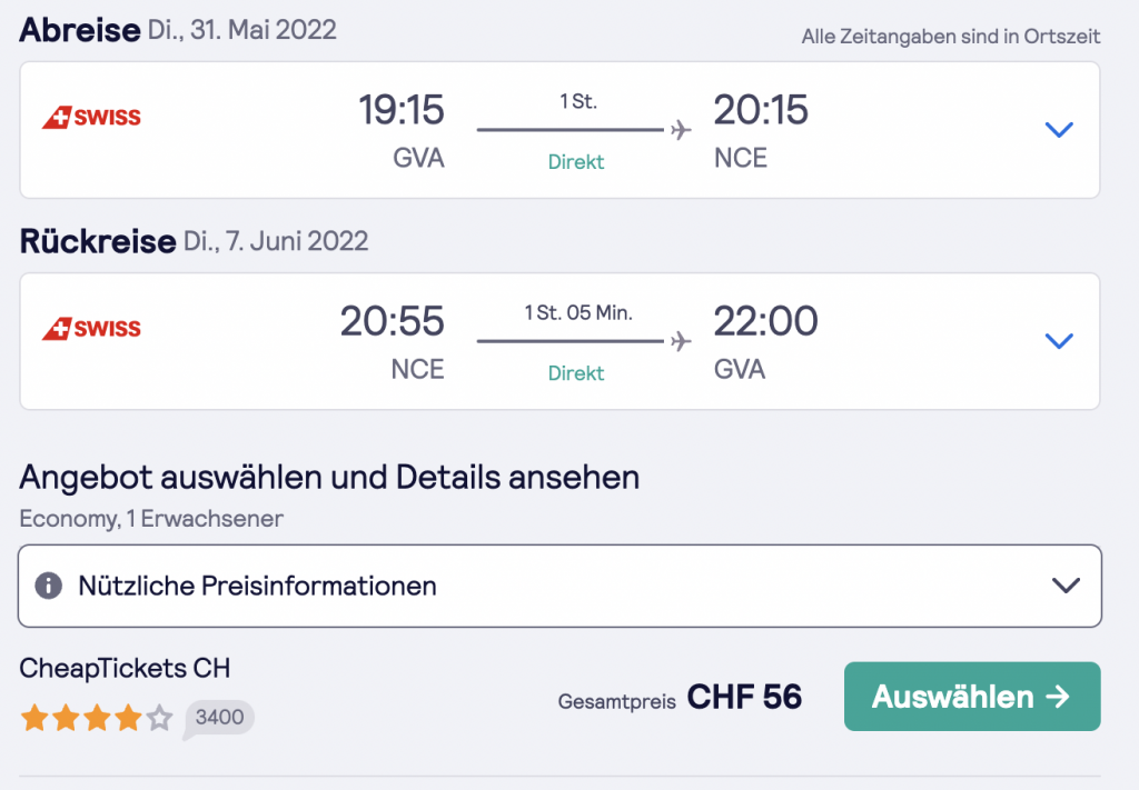 So fliegt man beispielsweise nach Nizza und zurück für 56 Franken, wenn man aktuell über CheapTickets bucht. Auf der offiziellen SWISS Seite beginnen die Preise bei CHF 76. Dies ist immer noch ein guter Preis, da bei SWISS immer ein kleiner Handgepäck Koffer im Preis inkludiert ist.