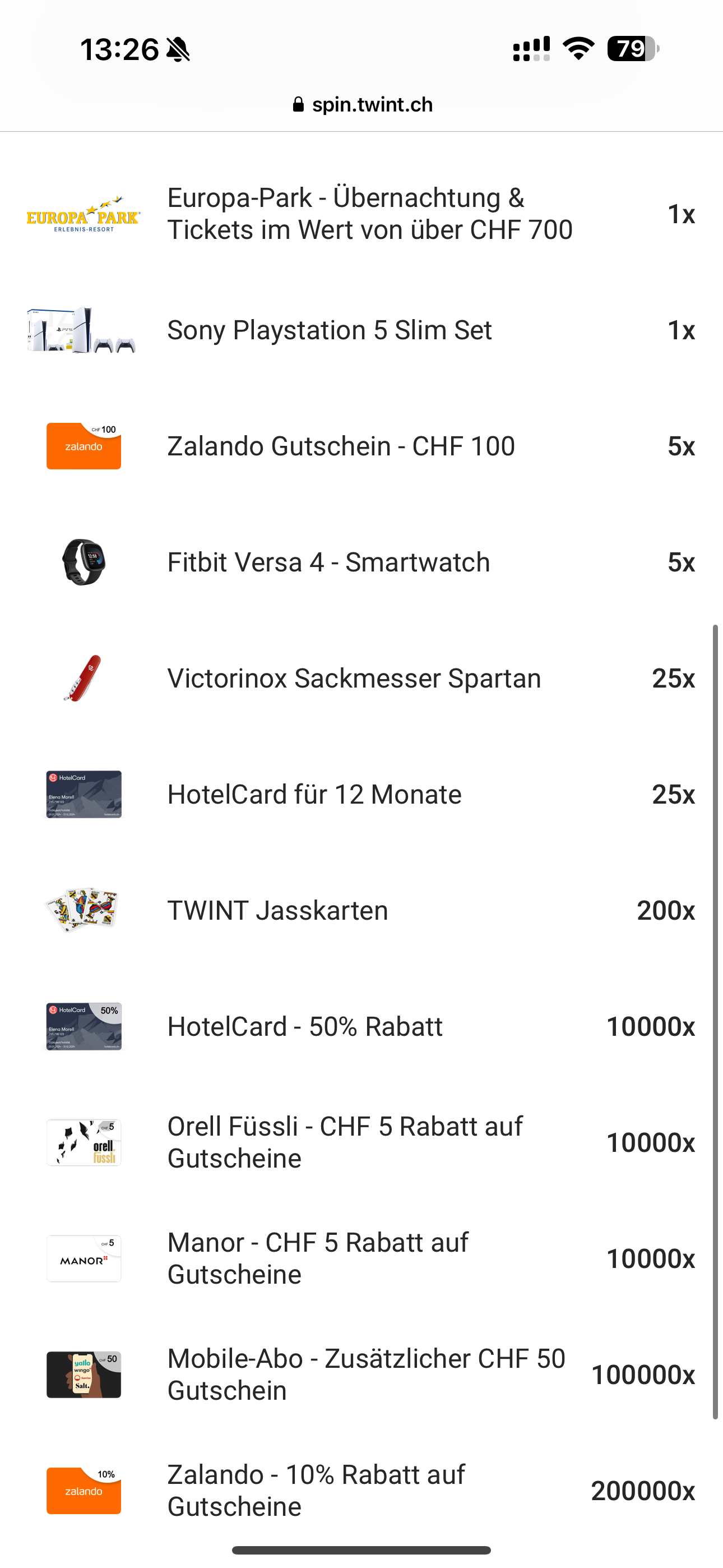 1x Manor 5.-, 1x Jasskarten und 1x nichts gewonnen. Ich find das Rad lustig, macht doch Spass. Cool dass Twint sowas macht.