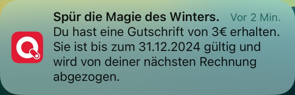 Bei FAIRTIQ gibt’s gerade eine Promo: Mit dem Code „SANTA24RVF“ erhält ihr eine Gutschrift von 3 Euro. Diese ist gültig bis zum 31.12.2024.
