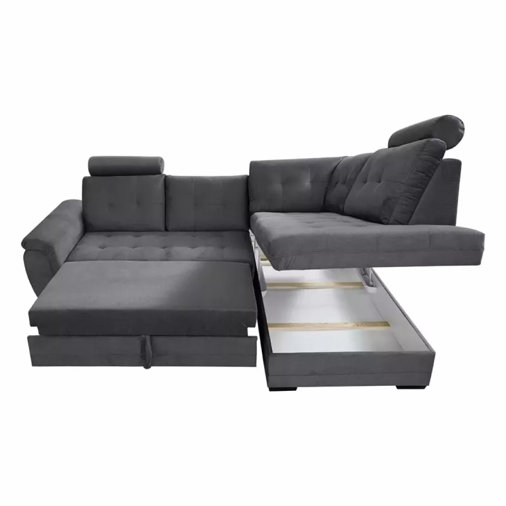 Das Ecksofa FALCO ist das perfekte Möbelstück für alle, die Komfort und Funktionalität schätzen. Mit seinen grosszügigen Massen von 251 x 183 cm bietet es Platz für bis zu 5 Personen und kann dank seiner Schlaffunktion und dem integrierten Bettkasten auch als Gästebett genutzt werden. Die Sitzhöhe von 43 cm und die Armlehnenhöhe von 60 cm sorgen für eine angenehme Sitzposition. Die höhenverstellbare Kopfstütze und die Nackenstützen sind im Lieferumfang enthalten und bieten zusätzlichen Komfort. Das Sofa hat einen grauen Stoffbezug und einen Korpus in derselben Farbe, während die eckigen Kunststofffüsse dem Möbelstück einen modernen Touch verleihen. Das Innenleben besteht aus Kaltschaum, Schaumstoff und einer Wellenunterfederung und die softmatte Oberfläche aus synthetischer Faser vermittelt ein angenehmes Sitzgefühl. Das Ecksofa FALCO hat eine Belastbarkeit von bis zu 120 kg pro Sitz und ist mit dem „Made in EU“ Zertifikat ausgezeichnet. Die Bettfunktionsart ist eine Vorziehbank und die Zusammenstellungsmöglichkeit ist eine Ottomane links in L-Form. Überraschen Sie Ihre Gäste mit einem komfortablen Schlafplatz oder geniessen Sie selbst den hohen Sitzkomfort des Ecksofas FALCO. Bestellen Sie jetzt und machen Sie es zum neuen Highlight in Ihrem Wohnzimmer!
