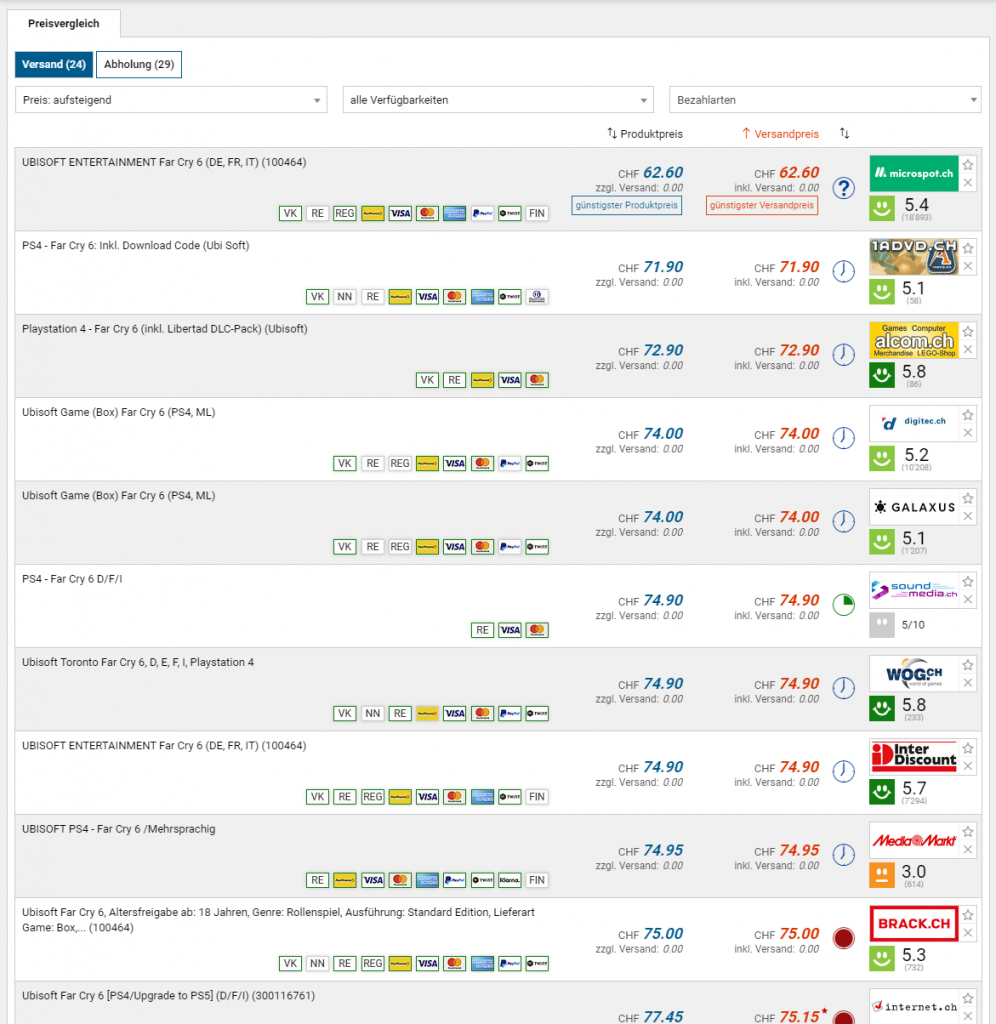 Bei microspot gibts derzeit das Spiel Far Cry 6 als Vorbestellung zum Preis von knapp 63 Franken. Damit wird as zweitgünstigste Angebot von CHF 71.90 um 8 Franken unterboten (laut toppreise), bei Amazon gibts das Spiel aber für etwa 70 Franken.