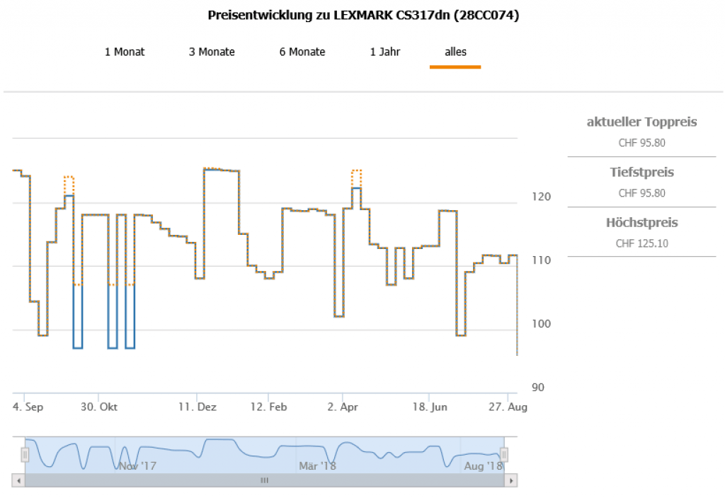 Gemäss toppreise gab es den Drucker bislang nie günstiger als für 99.- CHF inkl. Versand, der zweitbeste Preis liegt aktuell bei 111.63 CHF.