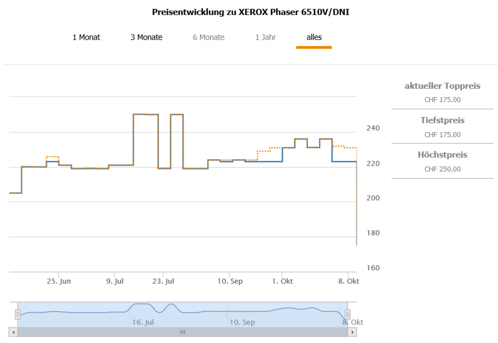 Gemäss toppreise gab es den Drucker bislang nie günstiger als für 204.95 CHF, der zweitbeste Preis liegt aktuell bei 230.90 CHF.