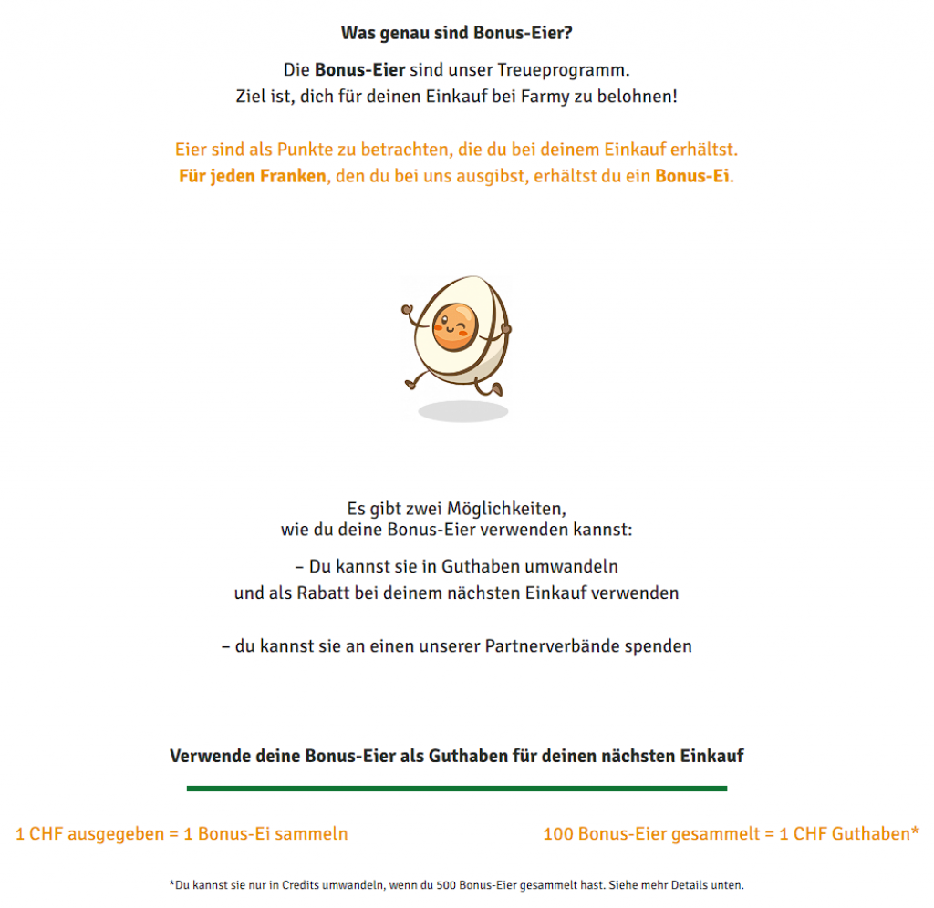 Bei Farmy gibt es zurzeit einen Gutschein für 500 Bonus Eier (Bonus-Eier = Treueprogramm von Farmy) ab einem Bestellwert von CHF 50.-
