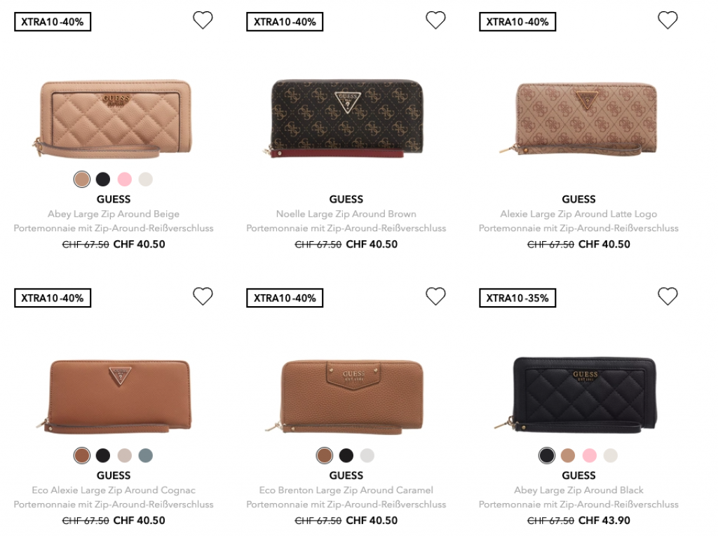 So gibt es mehrere GUESS Portemonnaies für je CHF 36.45 inkl. Versand. Der zweitbeste Preis für das Portemonnaie links oben liegt bei CHF 49.90 inkl. Versand. Die Preise hier sind noch vor Rabattabzug:
