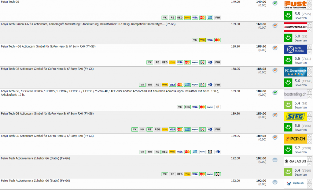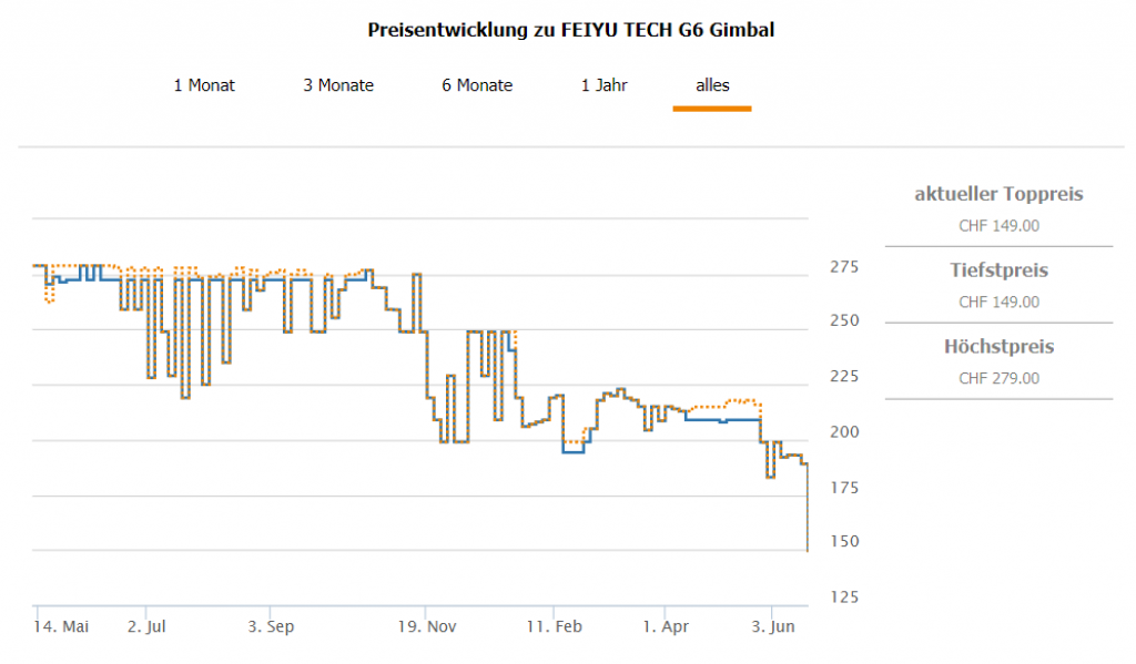Bei Fust erhält man gerade das FEIYU TECH G6 Gimbal zum neuen Bestpreis von CHF 149.- Derzeit gibt’s aus meiner Sicht leider keine Gutscheincodes, um das Angebot noch besser zu machen. Zweitbester Preis beträgt CHF 169.50, Bestpreis bis vor wenigen Tagen war CHF 183.-