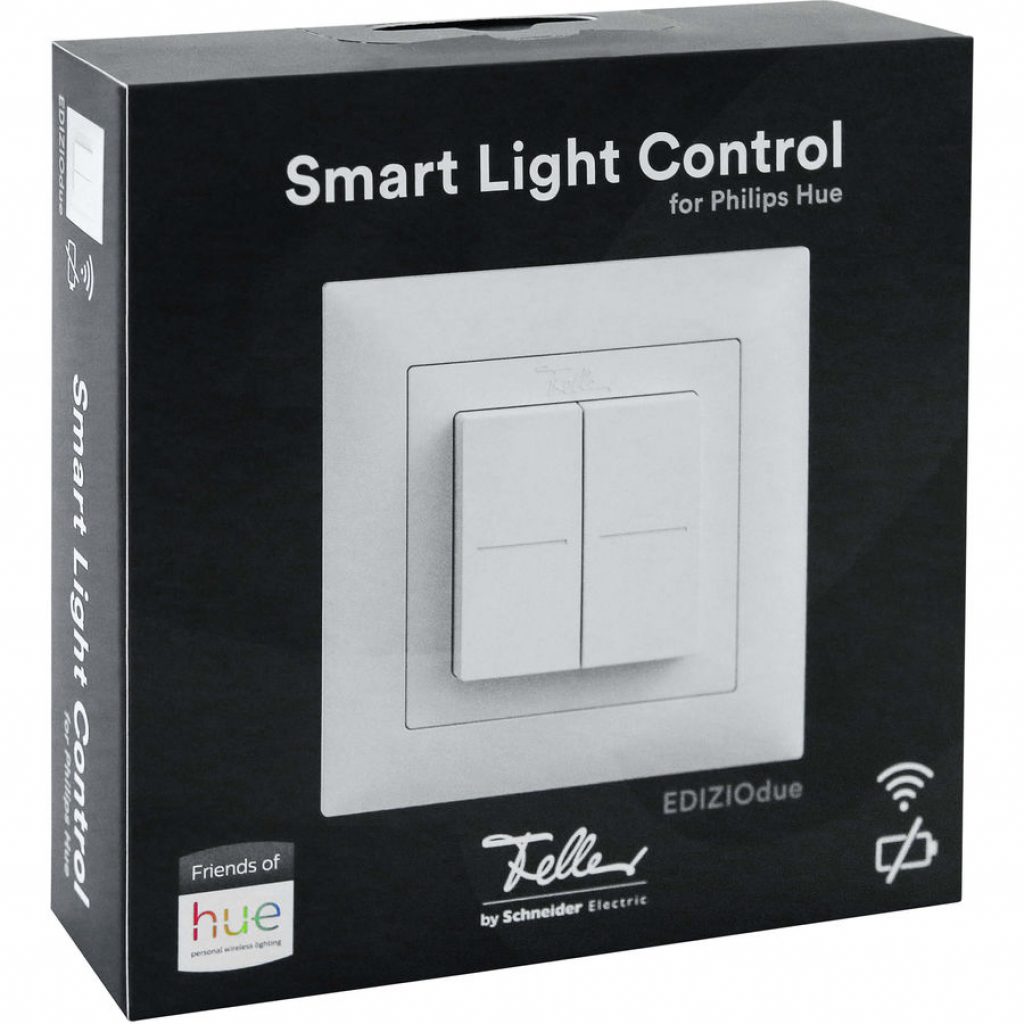 Smart Light Control von Feller ist ein batterieloser, wartungsfreier Funktaster zur Steuerung von Philips Hue Leuchten, der dank Wireless-Technologie keine Elektroinstallation erfordert.