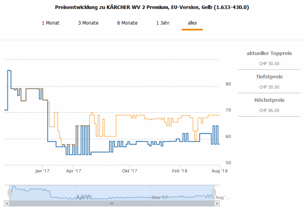 Gemäss toppreise gab es den Fensterreiniger inkl. Versand noch nie günstiger als für 57.05 CHF, der zweitbeste Preis liegt aktuell bei 68.95 CHF.