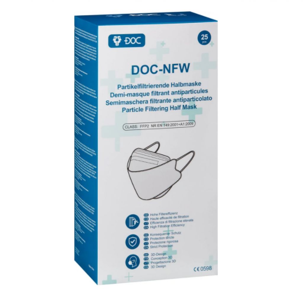 Die DOC FFP2-Masken weiss Fischform, ohne Ventil gewähren bestmöglichen Schutz vor Tröpfchen, Staub, Aerosolen, Schimmelsporen sowie Viren und Bakterien.