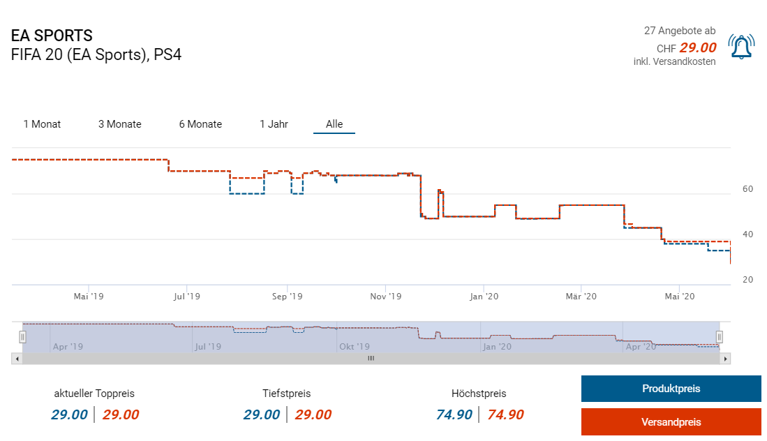 Bei digitec gibts ab heute das Spiel Fifa 20 als Disc in deutschem Layout zum Preis von 29 Franken zu kaufen. Laut toppreise gabs die deutsche Disc nie günstiger als für knapp 38 Franken vor wenigen Tagen. Die digitalen und internationalen Versionen gabs aber auch schon günstiger.