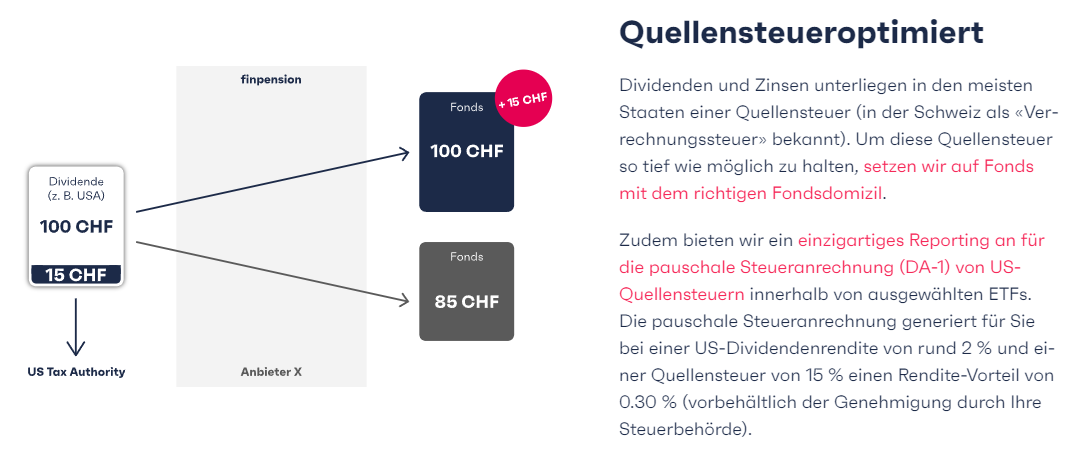 - Finpension bietet als 1. Anbieter die autom. Steueranrechnung/Ausweisung der US Quellensteuer. Das ist top! Bei einem US ETF oder all World ETF dies von Hand zu machen ist fast nicht möglich. Auch das sie Netting betreiben können als lizentiertes Fondhaus finde ich super. Zudem weisen sie die 0.3% Verwaltungskosten seperat aus, was man wiederum von den Steuern abziehen kann. Ich nutze die 98% Global Anlagelösung, da sie super nach Marktkapitalisierung geteilt ist. Ich bevorzuge diese Diversifikation gegenüber einem World ETF (meine Meinung).