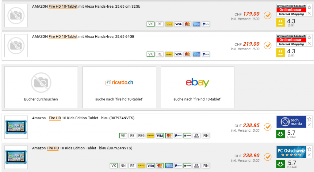 Bei Amazon.de gibt es momentan das Fire HD 10-Tablet für den unschlagbare Preis von CHF 74.75. Leider ist keine Preiskurve vorhanden und auch einen direkten Preisvergleich gibt es nicht. Ich habe ein weiteres Angebot auf Onlinebasar gefunden mit dem Preis von CHF 179.-.