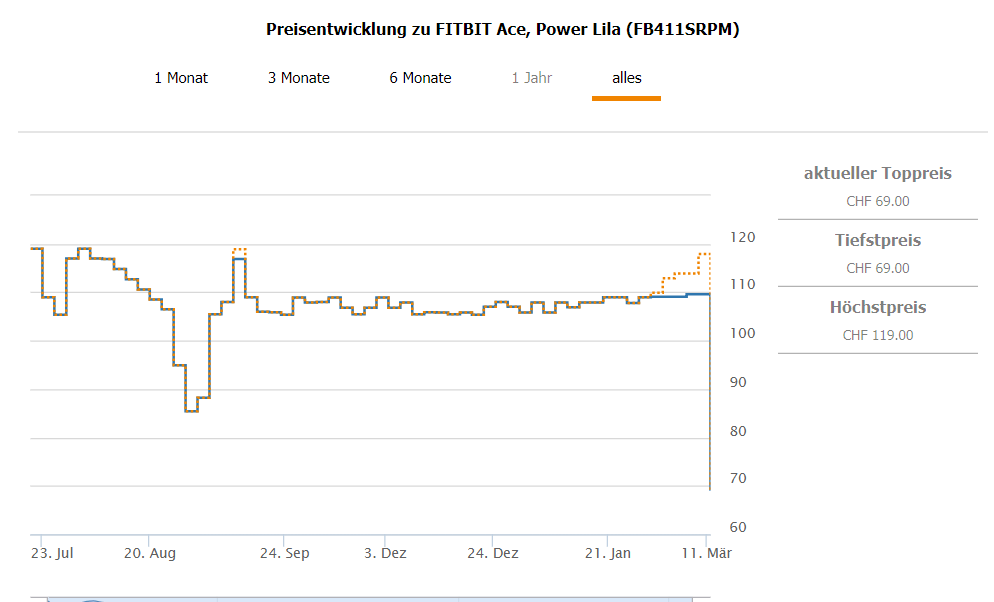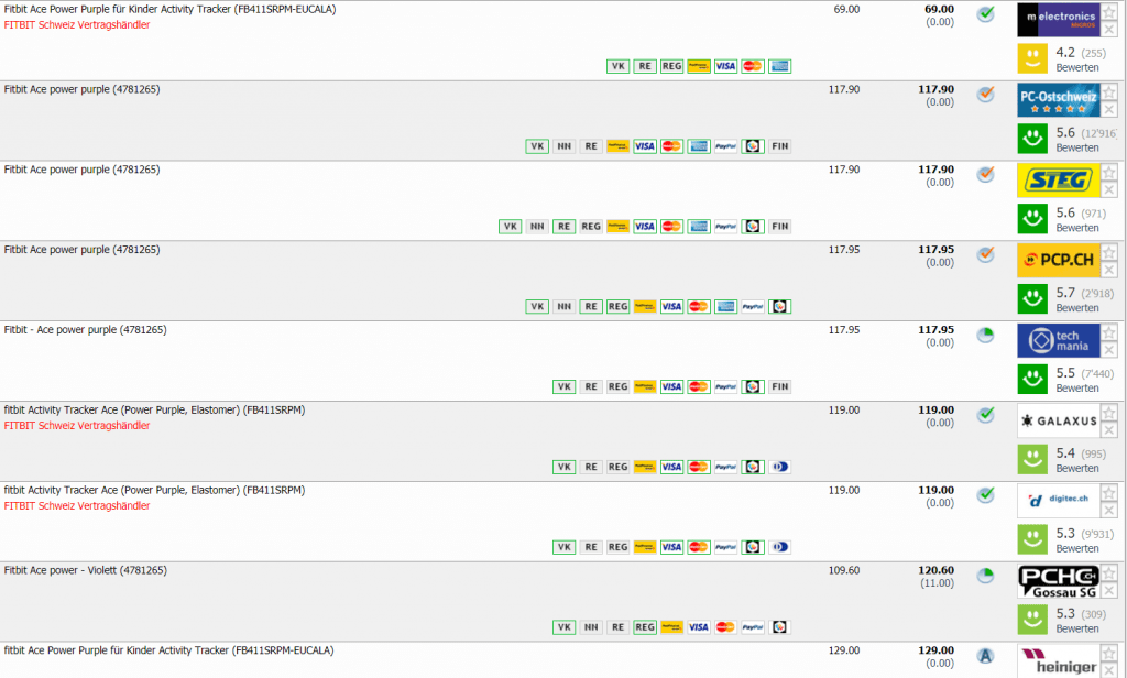 Bei melectronics erhält man den Fitbit Ace Activity Tracker für Kinder für CHF 69.- Meldet man sich noch zum Newsletter an (Wegwerf-Mailadresse) gibt’s noch einen 10.- Gutschein, somit kommt man auf CHF 59.- Zweitbester Preis in der Schweiz ist bei CHF 117.90 Bestpreis war bei CHF 85.40