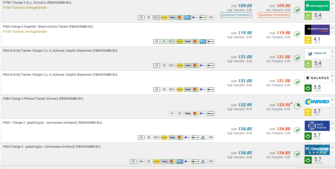 Bei Microspot gibt es die FITBIT Charge 3 für den neuen Bestpreis von CHF 99.-. Der vorherige Bestpreis war CHF 119.-. Der zweitbeste Preis beträgt CHF 119.90.