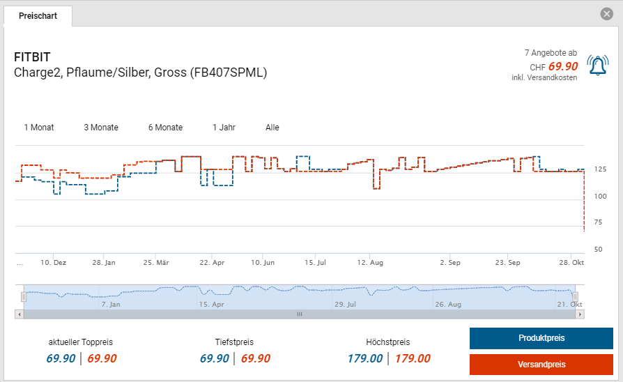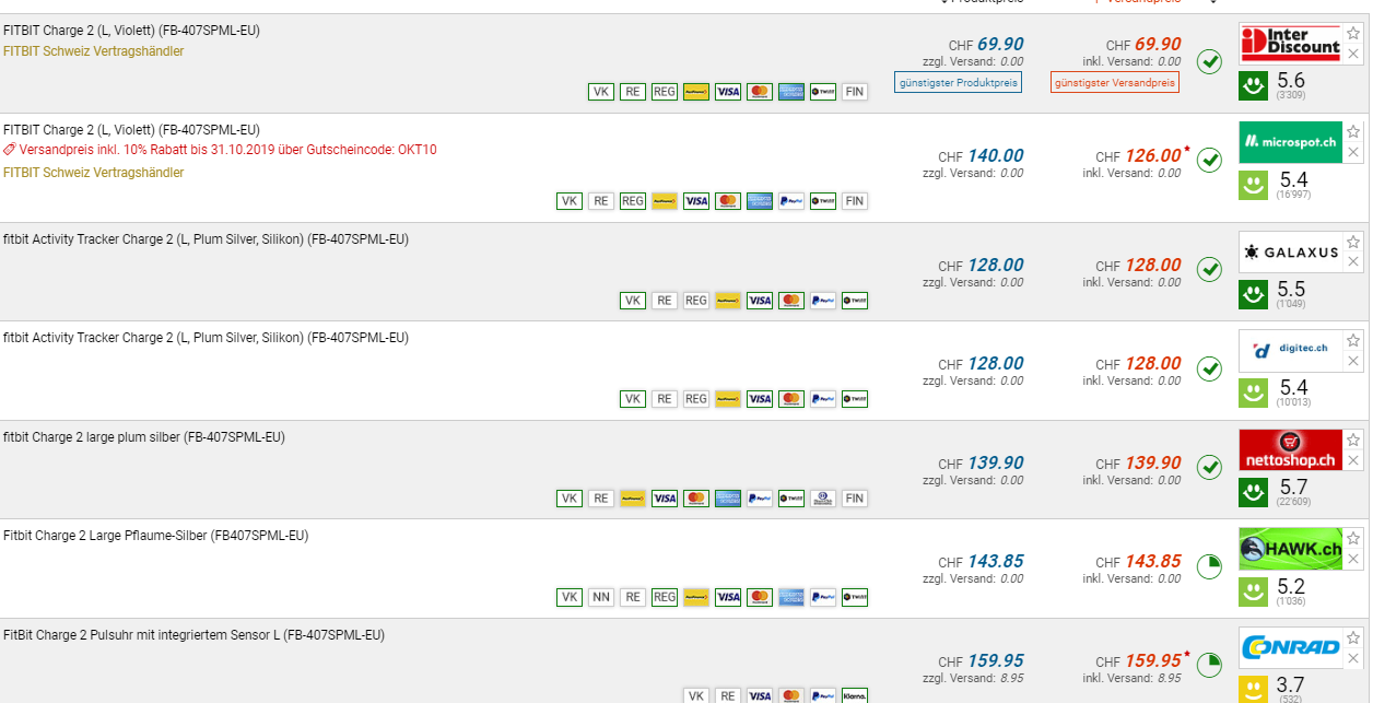 Bei Interdiscount gibt es die FITBIT Charge2 für den neuen Bestpreis von CHF 69.90. Der vorherige Bestpreis war CHF 109.-. Der zweitbeste Preis beträgt CHF 126.-.