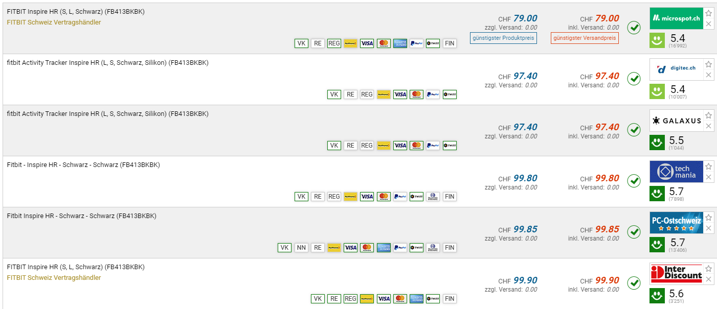 Bei Microspot gibt es momentan die FITBIT Inspire HR für den neuen Bestpreis von CHF 79.-. Der vorherige Bestpreis war CHF 89.90. Der zweitbeste Preis beträgt CHF 97.40.