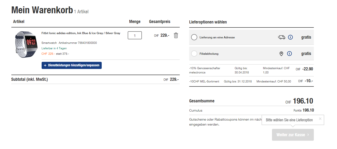 • Zum Deal klicken und die Fitbit Ionic adidas edition den in den Warenkorb legen