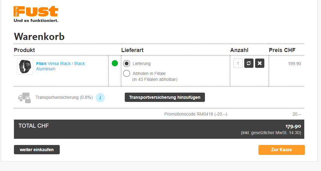 Bei Fust gibt es gerade eine Aktion auf das Fitbit Versa Black. Die Aktion an sich ist gar nicht so wahnsinnig gut, 50% und man hat immer noch nicht den Best Price in der Schweiz.