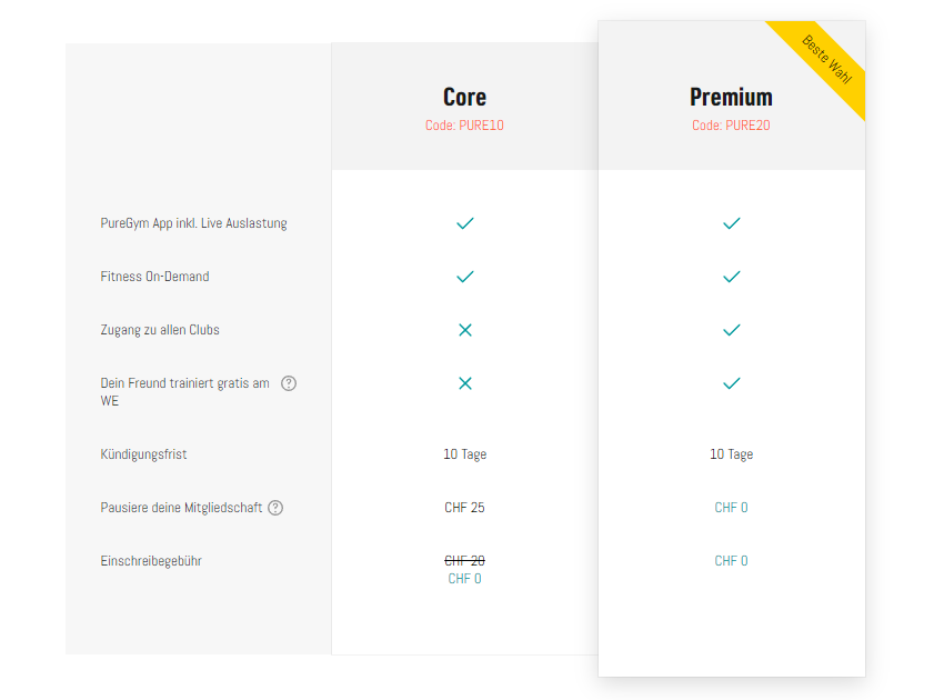 Nach dem ersten Monat kostet das Coreabo CHF 45.- pro Monat und das Premium CHF 69.-. Da aber Puregym so gut wie jeden Monat ähnliche Angebote macht, würde ich empfehlen das Abo zu künden und auf die nächste Angebote zu warten. 😆