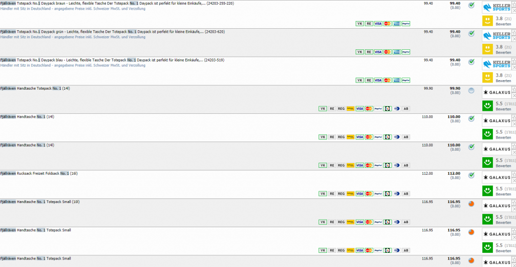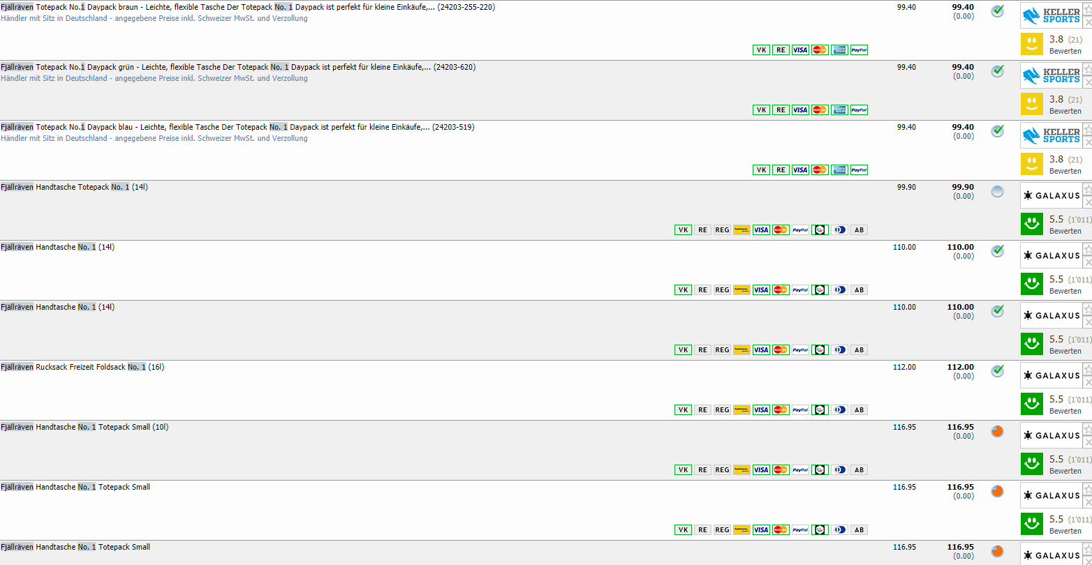 Galaxus bietet zurzeit eine begrenzte Anzahl der beliebten Fjällräven No. 1 Handtasche in schwarz für CHF 79.- an. Wir konnten zwar bei toppreise.ch keine Preischart finden, aber der günstigste Vergleichspreis (unabhängig von der Farbe) liegt bei CHF 99.40.