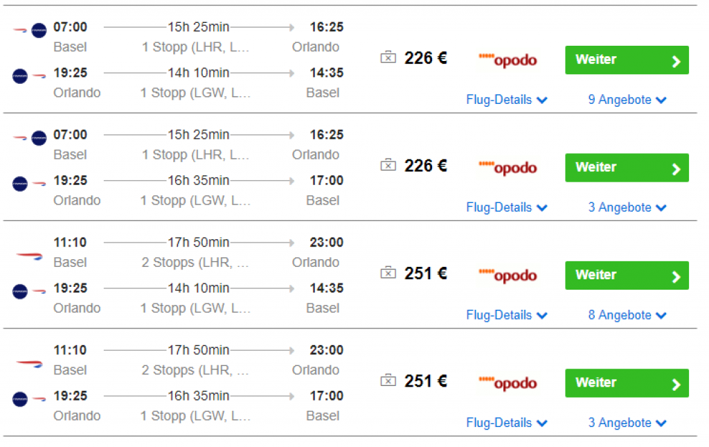 Aktuell bietet British Airways zusammen mit Iberia und American Airlines günstige Flüge nach Florida an. Im Reisezeitraum September - März kann man von Basel oder Zürich ab 190€ nach Orlando, Miami, New York uvm. reisen.