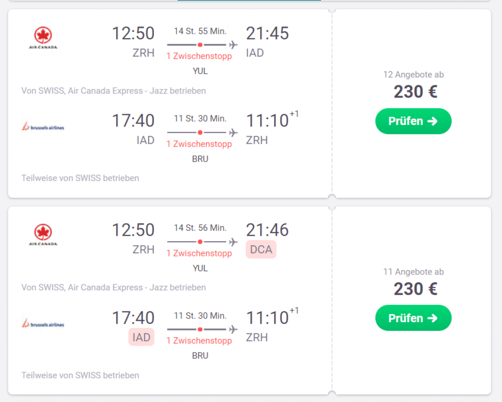 Die Flüge sind jeweils mit einem Zwischenstopp. Je nach dem in Brüssel, Montreal, Genf oder einem anderen Flughafen.