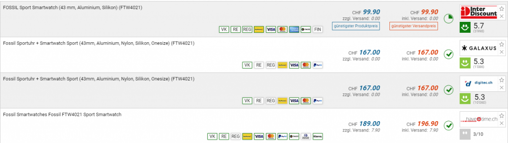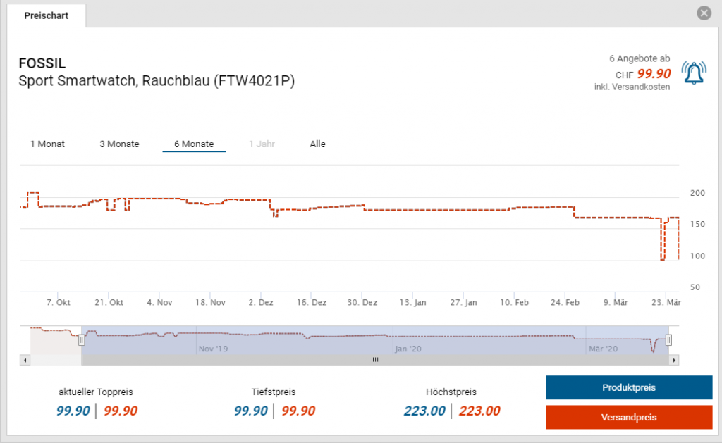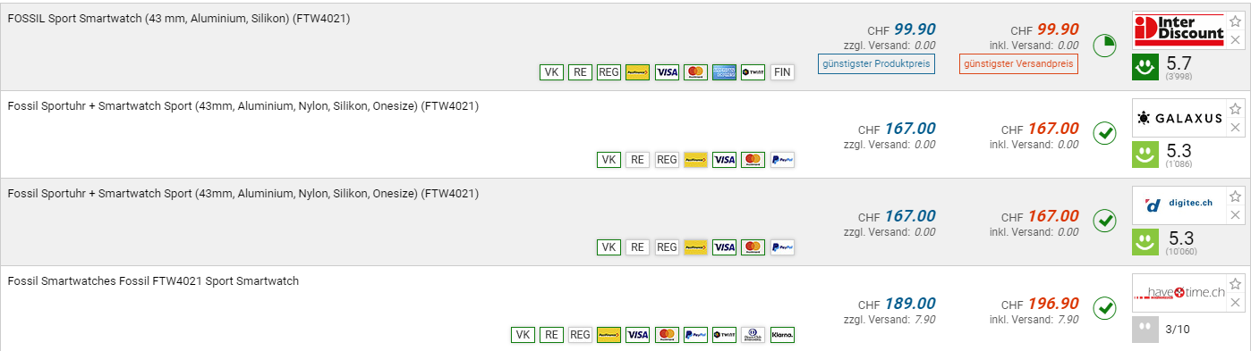 Bei Interdiscount gibt es wieder die FOSSIL Sport Smartwatch für den Bestpreis von CHF 99.90. Zuletzt war der Preis vor einer Woche so niedrig. Der zweitbeste Preis beträgt CHF 167.-.