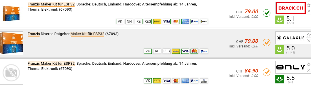 Bei DayDeal gibt es das Franzis Elektronik Maker Kit für den Bestpreis von CHF 39.-. Der zweitbeste Preis beträgt CHF 79.-.