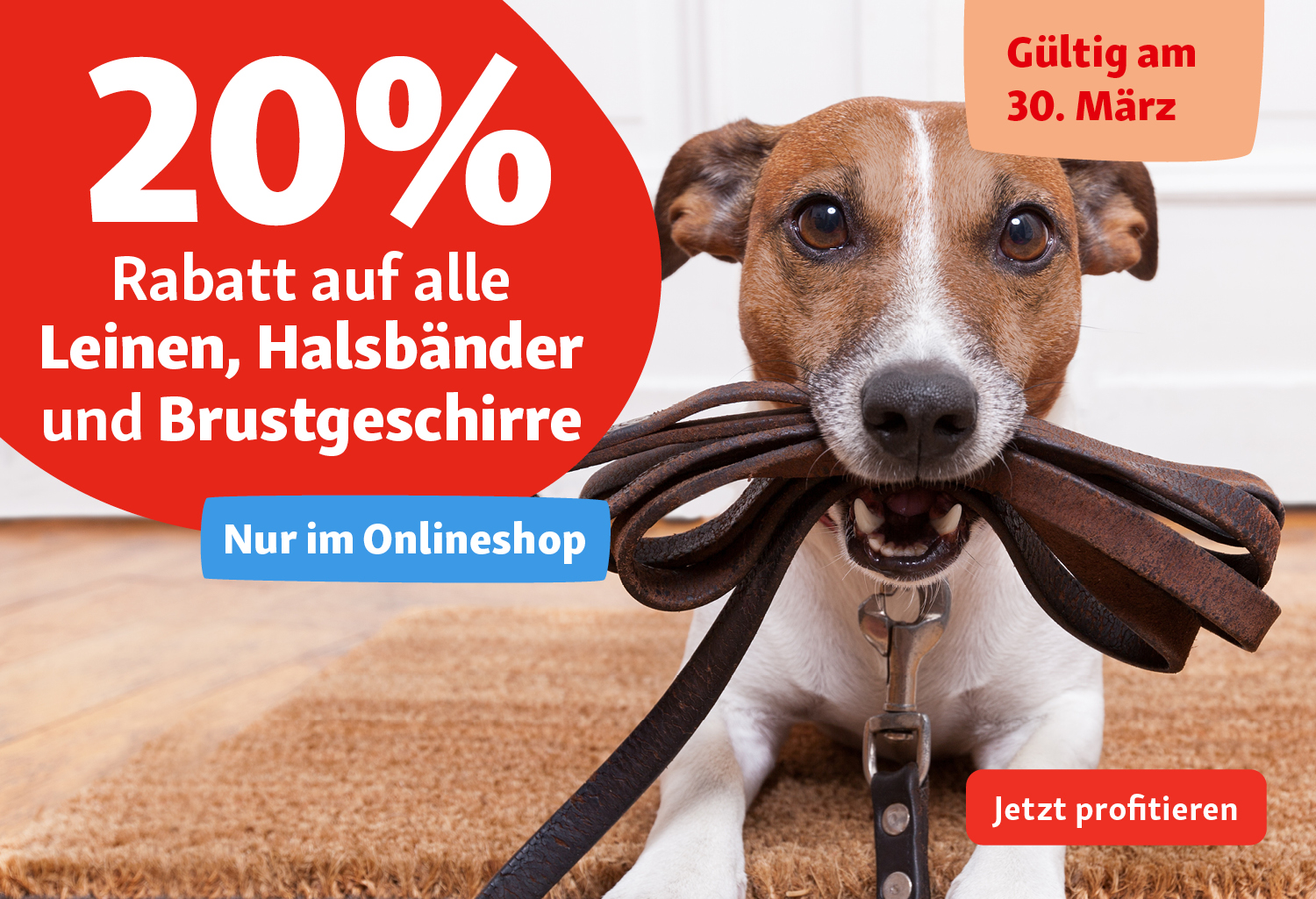 Bei Fressnapf gibt’s nur heute 20% Rabatt auf Leinen, Halsbänder und Brustgeschirre im Onlineshop. Die Aktion lässt sich auch mit den bekannten Gutscheinen von Fressnapf kombinieren für eine noch grössere Ersparnis, sofern ihr die jeweiligen Mindestbestellwerte erreicht 😉