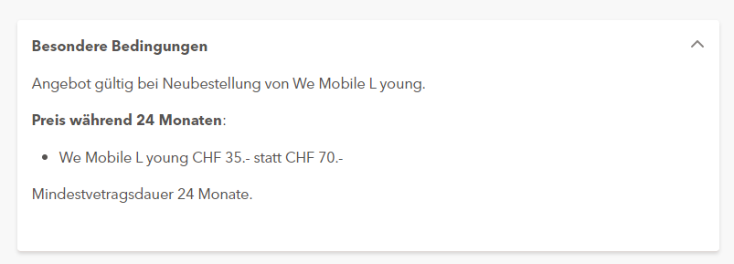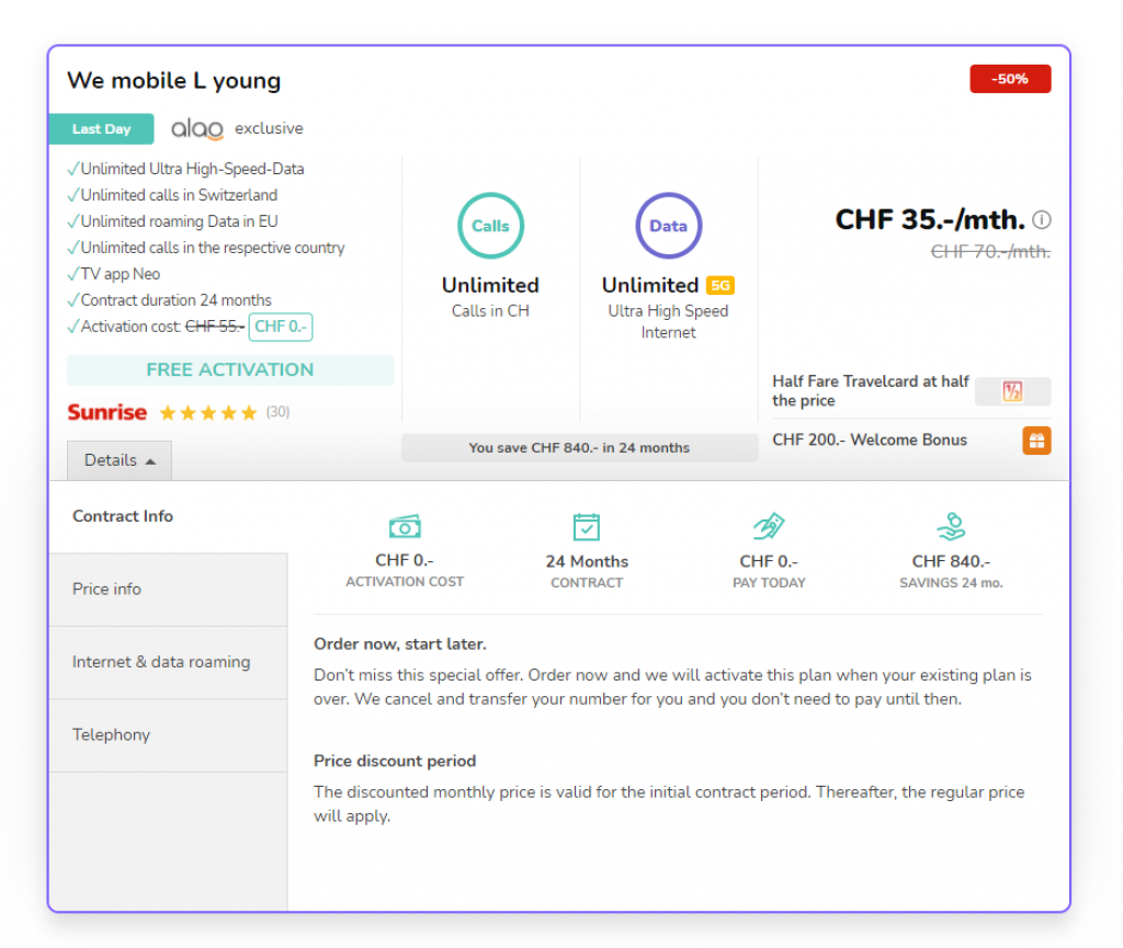 Bei alao gibts derzeit ein hammerwürdiges Angebot für alle unter 30 Jährigen. So gibts das Mobilabo We Mobile L Young von Sunrise zum Aktionspreis von gerade einmal 35 Franken pro Monat, mit einer Mindestvertragslaufzeit von 24 Monaten (2 Jahren).
