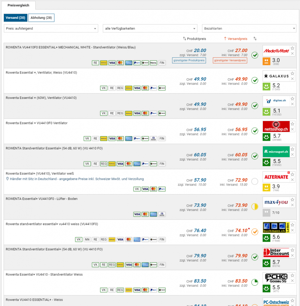 Bei MediaMarkt gibts derzeit den Standventilator Rowenta VU4410F0 zum Aktionspreis von 20 Franken. Der Preis gilt allerdings nur für Abholer oder Besteller mit einem Warenkorbwert von mind. 50 Franken, sonst kommen noch 7 Franken an Versandkosten hinzu.