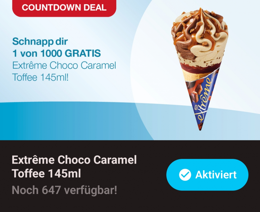Schbell zuschlagen - bei k kiosk könnt ihr euch aktuell ein gratis Cornet Extreme Choco Caramel Toffee holen. In der App werden zwar noch 647 angezeigt, es scheint aber etwas im Rückstand zu sein.