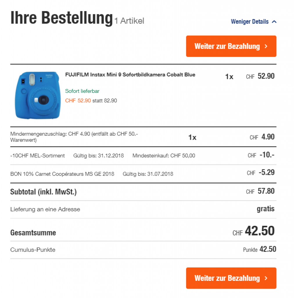 melectronics hat heute viele attraktive Angebote. Auch die FUJIFILM Instax Mini 9 gibt’s zum Best Price Ever. Bisher war man ungefähr ab ca. 70 Franken mit dabei, nun gibt’s die Instant-Kamera für CHF 42.50 - kauft man noch etwas mehr ein, entfällt auch der Mindermengenzuschlag von CHF 4.90.