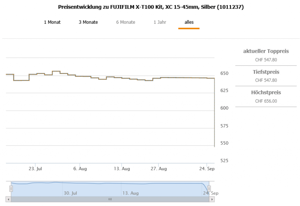 Das Kit gab es bislang (über alle Farben) nie günstiger als für 638.50 CHF, der zweitbeste Preis liegt aktuell bei 547.80 644.- CHF. Nur für den Body ist bestprice und zugleich zweitbester Preis aktuell 549.- CHF.