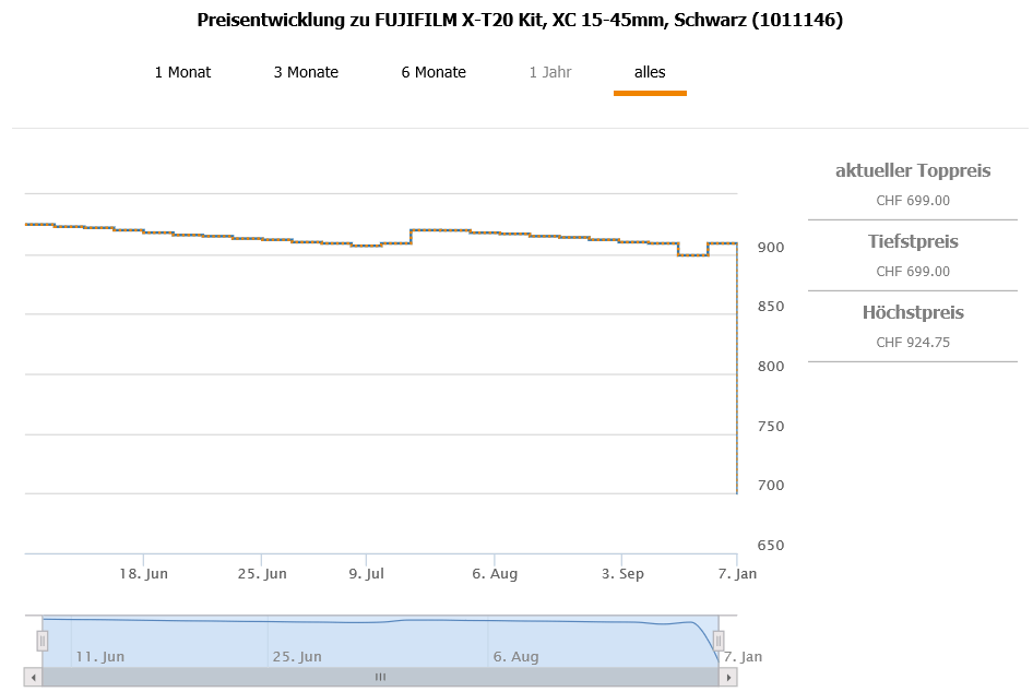 Bei digitec gibt es aktuell die FUJIFILM X-T20 als Kit mit XC 15-45mm Objektiv für 699.- CHF.